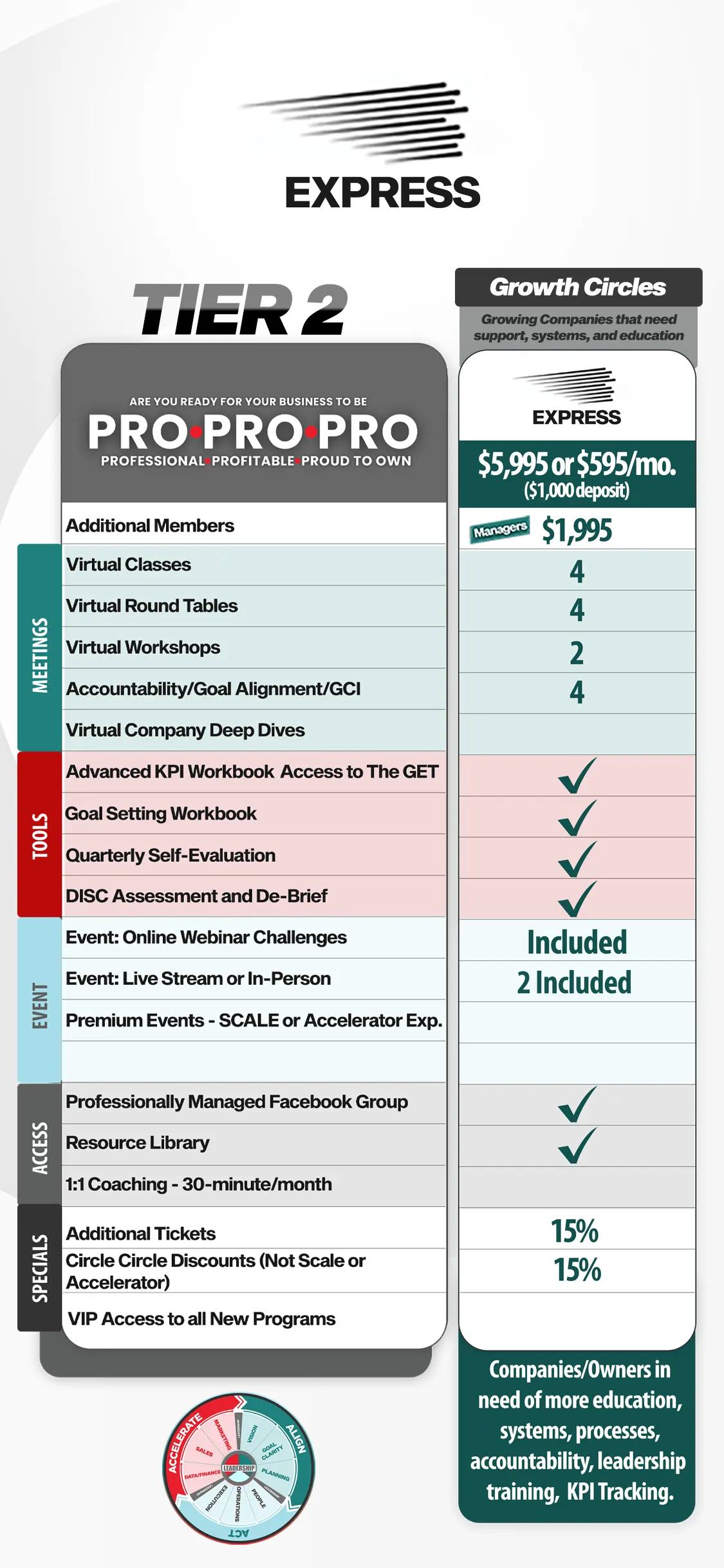 Bridge builds foundations. Challenge refines and implements. Express raises the pace: weekly challenges, three coaching calls each week, a weekly Deep Dive, and a custom roadmap tied to KPIs—optimized for speed and leadership focus.